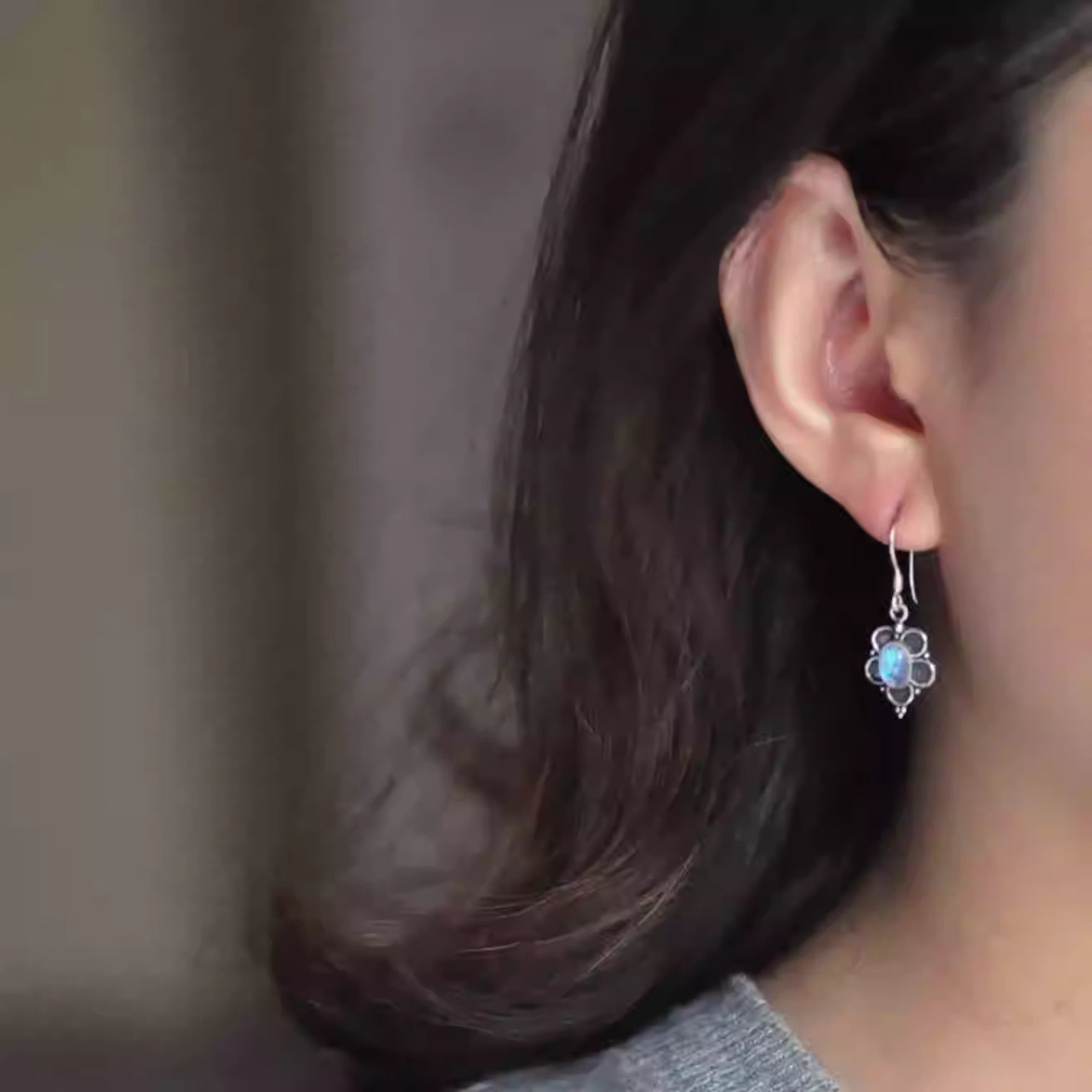 S925 Sterling Silver Earrings Inlaid Natural Moonstone Earrings Blue Light Retro Compact Women