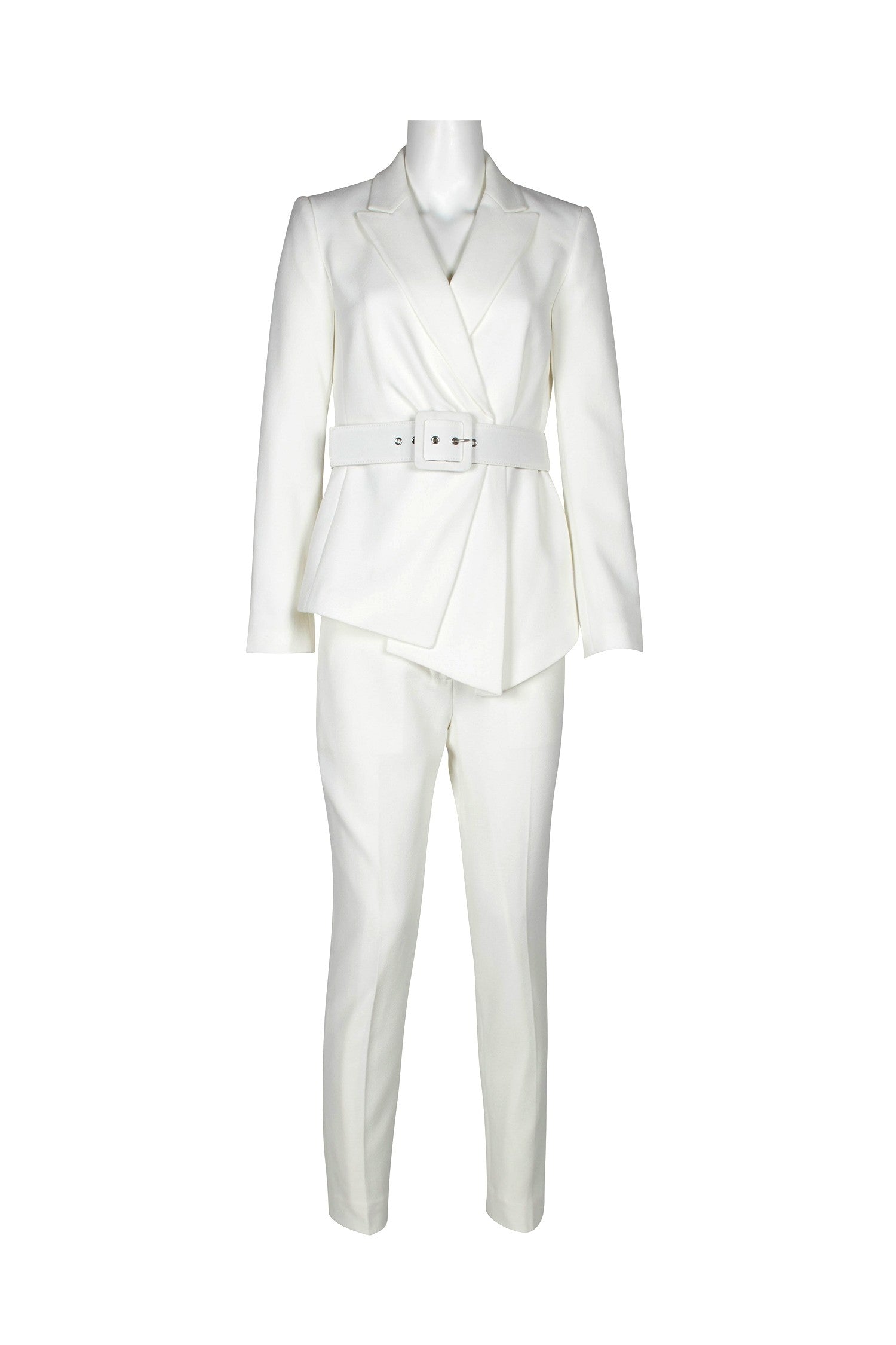 Tahari ASL Notched Collar Long Sleeve Pleated Belted Crepe Pants Suit Two Piece Set; Fabric: Crepe (95% Polyester 3% Elastane) Lining (94% Polyester 6% Elastane); Fabric Content: LINED