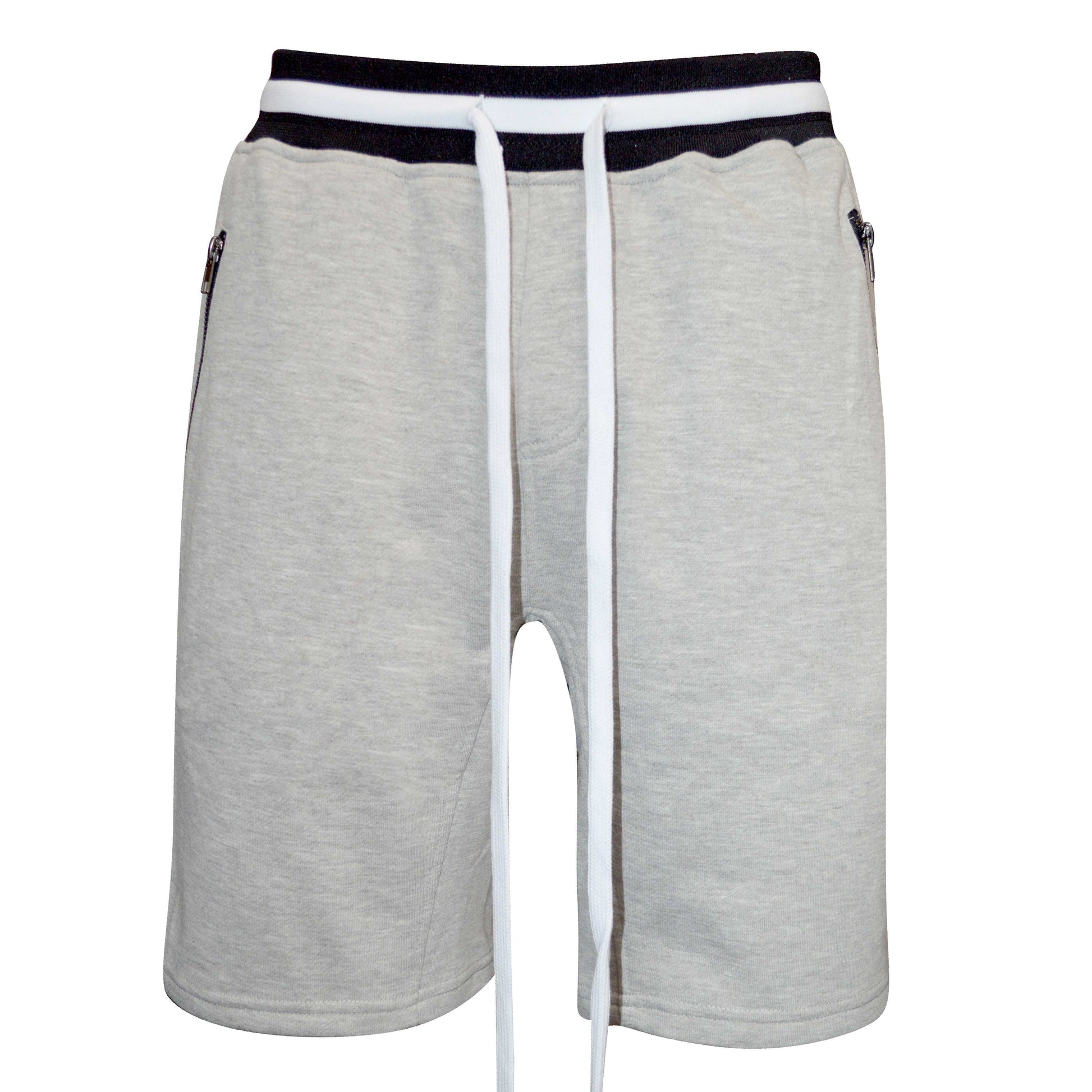 The short features striped ribbing at the waist, striped and notched taping at the bottom hem, zipper pockets on the front, and a black drawstring.French Terry fabric was used for ease in mobility.