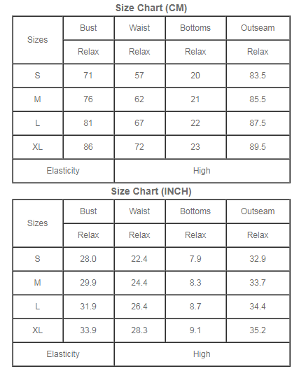 Sizes | Bust | Waist | Bottoms | Outseam |
